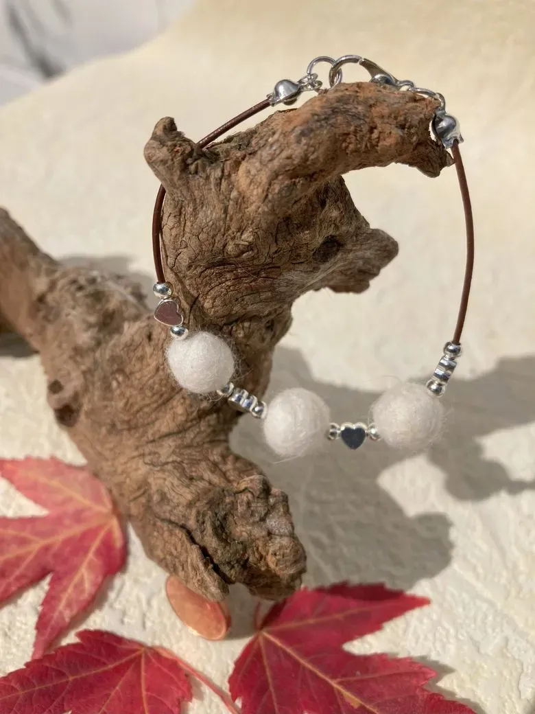 Armband aus Leder mit drei Fellkugeln, Zierperlen und Herz-Charms mit Schließe