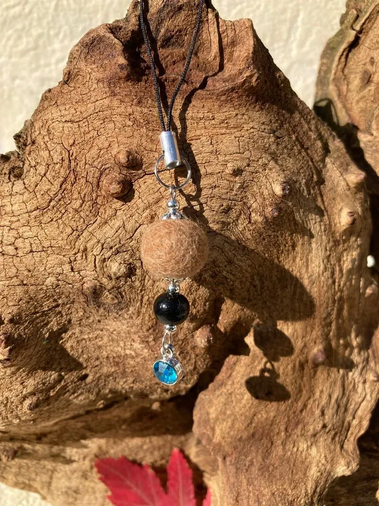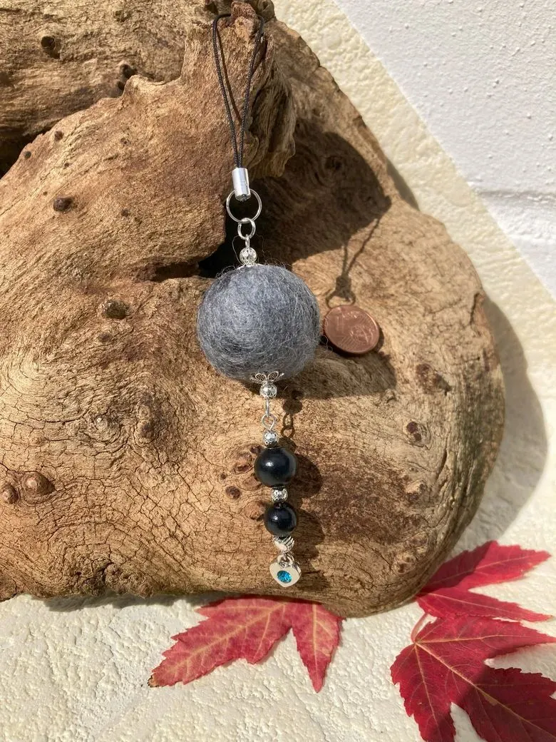 Fellkugel mit silberfarbenen Kugelkappen und Zierperlen, Holzperle und Charm an Lanyard