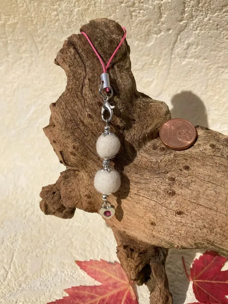 Fellkugeln mit Zierperlen, Herz-Charm und silberfarbenen Kugelkappem mit Lanyard