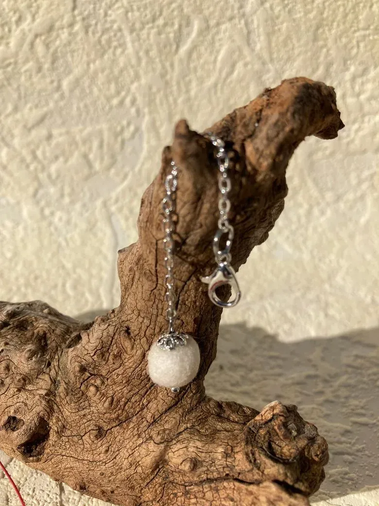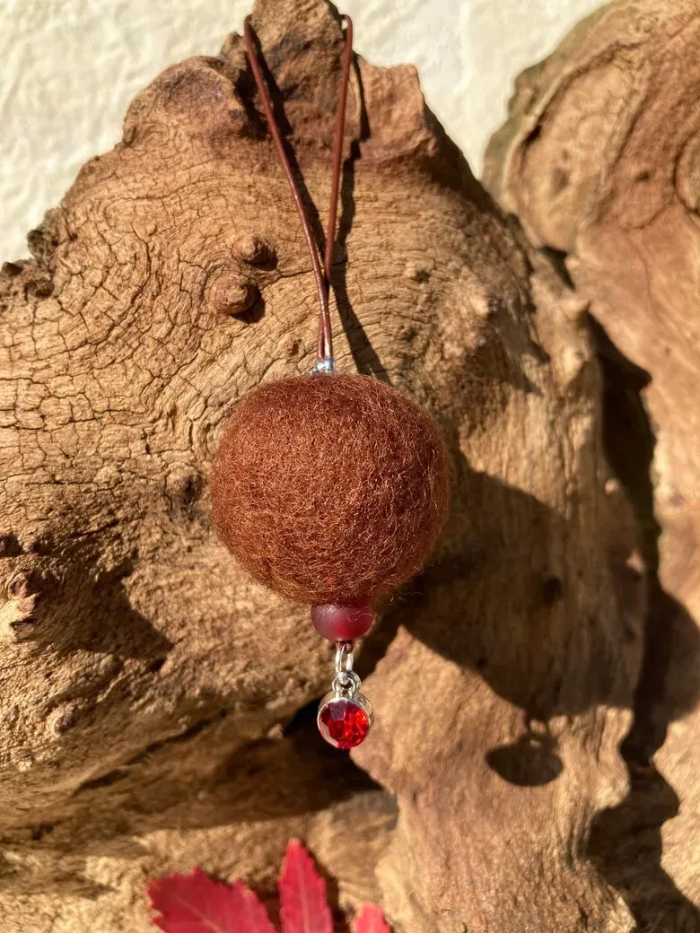 Fellkugel mit satinierter Glasperle, Charm, silberfarbenen Kugelkappen und Lederband